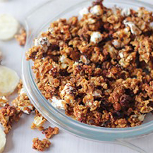 Giet het mengsel op de bakplaat. Zet in de oven en bak 15 minuten, terwijl je het mengsel tussendoor een paar keer omschept. Zet de oven na 15 minuten uit en laat helemaal afkoelen in de oven.