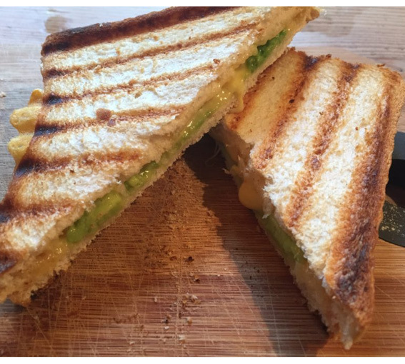 Beleg twee boterhammen met plakken kaas, avocado en uitgeperste knoflook.