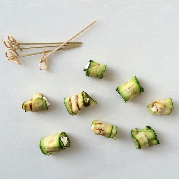 Zo maak je hetSchaaf (met een kaasschaaf) dunne plakken van de courgette. Grill de plakken een paar minuten om en om. Leg een beetje geitenkaas en walnoot op de de courgette en maak hier rolletjes van.