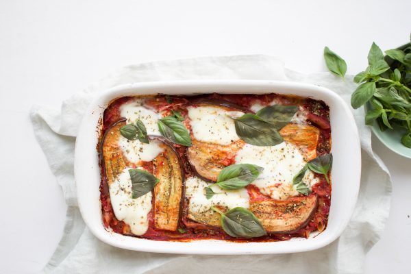 Ovenschotel met pasta, plakken aubergine, mozzarella en basilicum. Een heerlijk comfort gerecht.