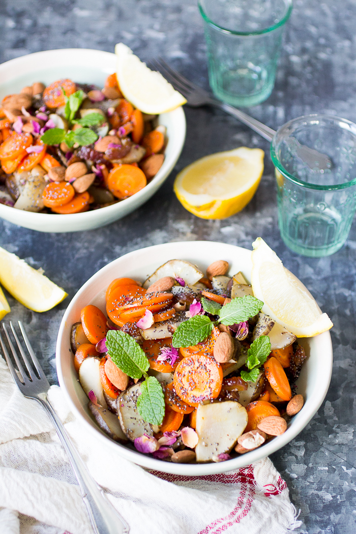 Daarom besloot ik de aardperen en wortels te roosteren en deze te combineren met het zoete van een paar Medjool dadels, frisse muntblaadjes, knapperige noten en zaden en als final touch wat rozenblaadjes en citroen. Heerlijk!