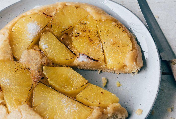 Eigenlijk is het maken van een ananas tarte tatin helemaal niet zo lastig. Je kunt best lastig doen over het maken van de karamel. Die methode gebruik ik voor dit recept niet. Daarmee is het veel gemakkelijker om te maken, je krijgt alleen niet die hele mooie bruine karamel laag over het fruit. Maar lekker blijft het wel. Daarmee is gelijk het laatste onderdeel van de tarte tatin maken het meest lastige punt en dat is dat ding omkeren terwijl hij gloeiend heet is.