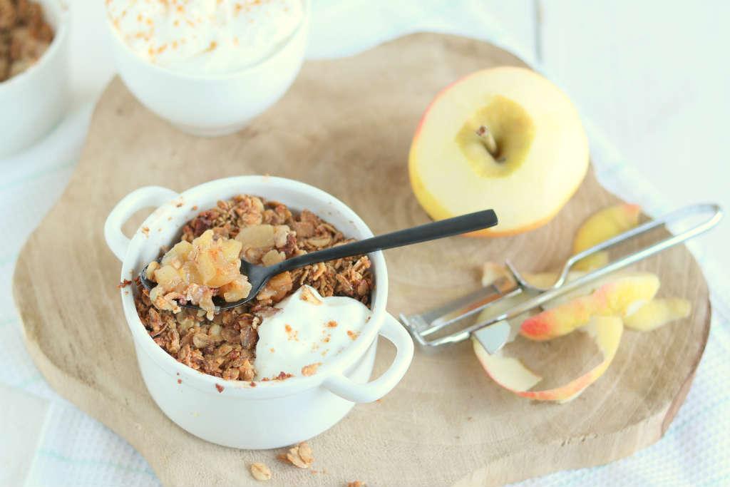 Sponsored. Oh, ik heb toch een lekker ontbijt recept voor jullie vandaag: appelcrumble met kwark. In de wintermaanden lig ik ’s ochtends altijd zo lekker en dan heb ik wat moeite met opstarten. De kou en het feit dat het zo donker is, maakt het er allemaal niet makkelijker op. Als je weet dat deze ontbijtcrumble op je wacht, wil je je bed wel uitkomen.