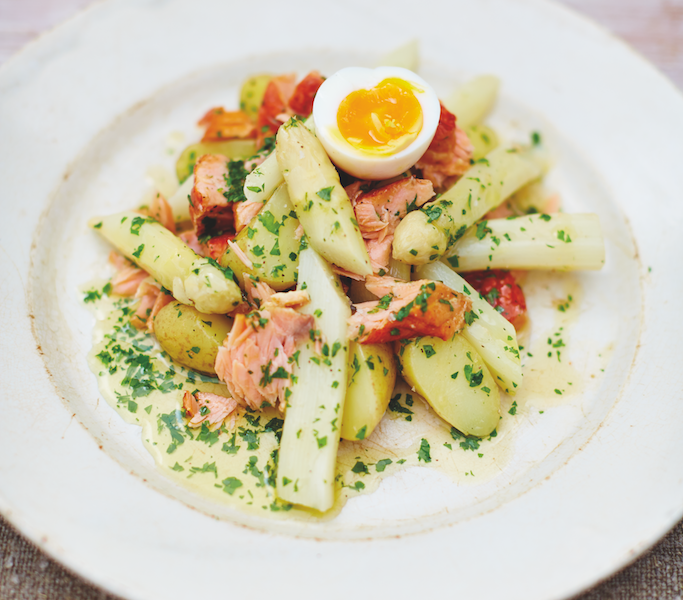 Dat asperges naast ham & Hollandaise saus ook bijzonder goed combineren met vis is allang geen geheim meer. En dat is waar onze eigen Bart van Alphen, dé expert op het gebied van duurzame vis, om de hoek komt kijken. Bart heeft met Fish Tales Magazine een nieuw online magazine gestart, dat zeker over meer gaat dan alleen maar (duurzame) vis. Naast recepten vind je er kookvideo’s, instructies over fileren en schoonmaken, verhalen over vissers en havens, hotspots in Nederland en daarbuiten. Iedere week serveert Bart in ieder geval drie nieuwe verhalen en drie nieuwe recepten. Uit dat magazine komt ook het recept voor deze asperges met warmgerookte zalm.