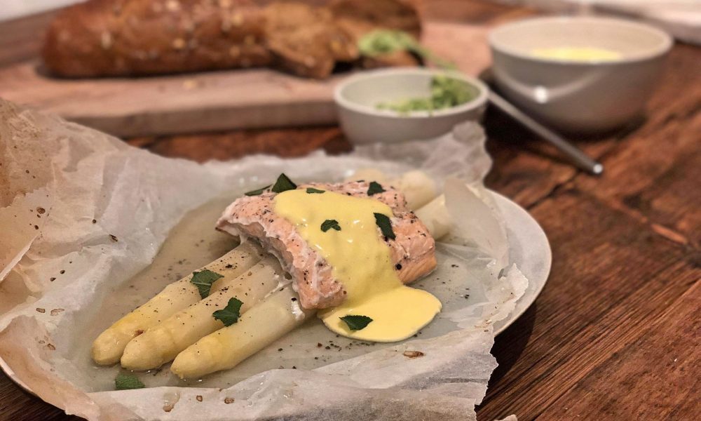 Witte asperges zijn fantastisch op de klassieke manier (met ham, ei en krieltjes), maar ze gaan ook perfect samen met zalm. Ik ben dus meteen naar de Lidl gelopen voor zalmfilet, een lekker vers stokbroodje en zo’n handig pakketje met kruiden speciaal om kruidenboter mee te maken.