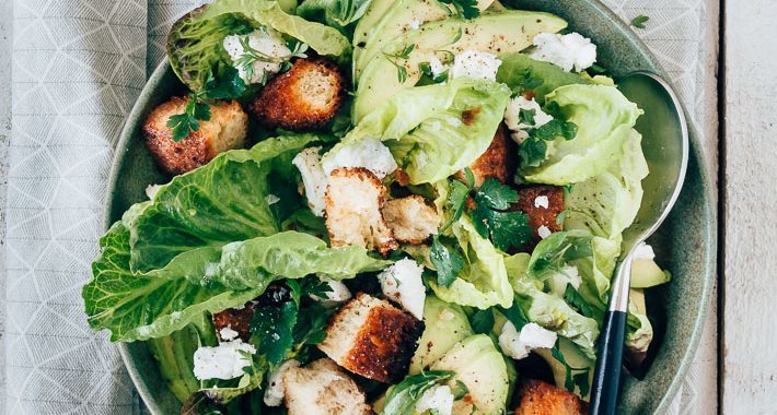 De zelfgemaakte broodcroutons zorgen voor iets knapperigs in de salade. Ik maak ze van ongesneden zuurdesembrood. Waardoor je heel fijn zelf de grootte van je croutons kunt bepalen. Je kunt blokjes snijden of langwerpige plakken maken. Als je het brood maar lekker even in de pan bakt. De sla maakt deze avocadosalade ook heel lekker fris en knapperig. Gebruik hiervoor bijvoorbeeld romaine kropjes. Van die kleintjes. Je haalt dan de blaadjes los, die je in zijn geheel in de salade verwerkt. Zo ziet je avocadosalade er ook gelijk heel mooi uit! Wat mooie verse kruiden er over en wat tuinkers en klaar ben je!