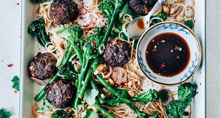 Nou kun je natuurlijk gewoon een portie Aziatische gehaktballetjes maken en tijdens een borrel uitserveren. Lijkt mij zelfs een heel goed idee. Maar om er toch nog maar een fijne maaltijd van te maken serveer ik er bimi (ook al zo’n favoriet) en fijne noedels bij. Je kunt er elke soort noedels bij serveren die je wilt, op de foto gebruikte ik dunne rijstnoedels, gewoon als afwisseling. Natuurlijk kun je het ook heel goed eten met wat rijst.