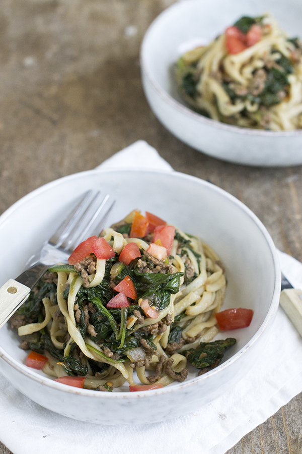 In verband met de verhuizing probeer ik mijn voorraadkast leeg te koken en daarom ben ik wat meer aan het freestylen. Ik combineer soms ingrediƫnten die ik in principe niet zo snel samen zou eten, maar die allebei op moeten. En soms komen daar verrassend lekkere combinaties uit. Zoals deze Bami met spinazie en gehakt. Niet alleen wij, maar ook onze kleine meid heeft hier ontzettend van zitten smullen. Het was alsof ze taart at ;)