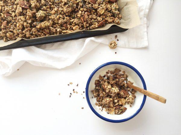 Als ik dan toch een nieuwe pot granola ga maken, waarom dan niet in combinatie met banaan?! Hoef ik s’ochtends alleen maar een grote lepel granola uit de pot te scheppen en klaar! Nadat de granola de oven uitkomt nog wat rauwe cacaonibs erdoor, omdat dit extra energie geeft in de ochtend. En banaan en chocola is gewoon een perfecte combi.