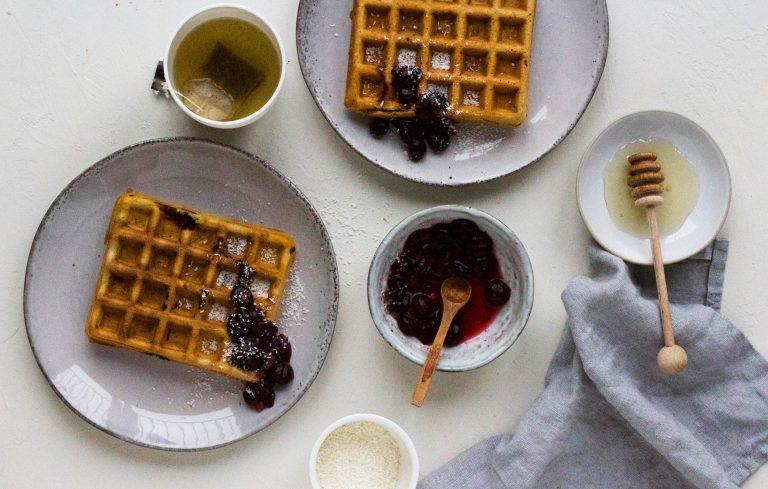 Deze wafels zijn heerlijk met een simpele blauwe bessen compote. Garneer ze ook nog lekker met wat agave en kokosknippers voor een echt wafel feestje!