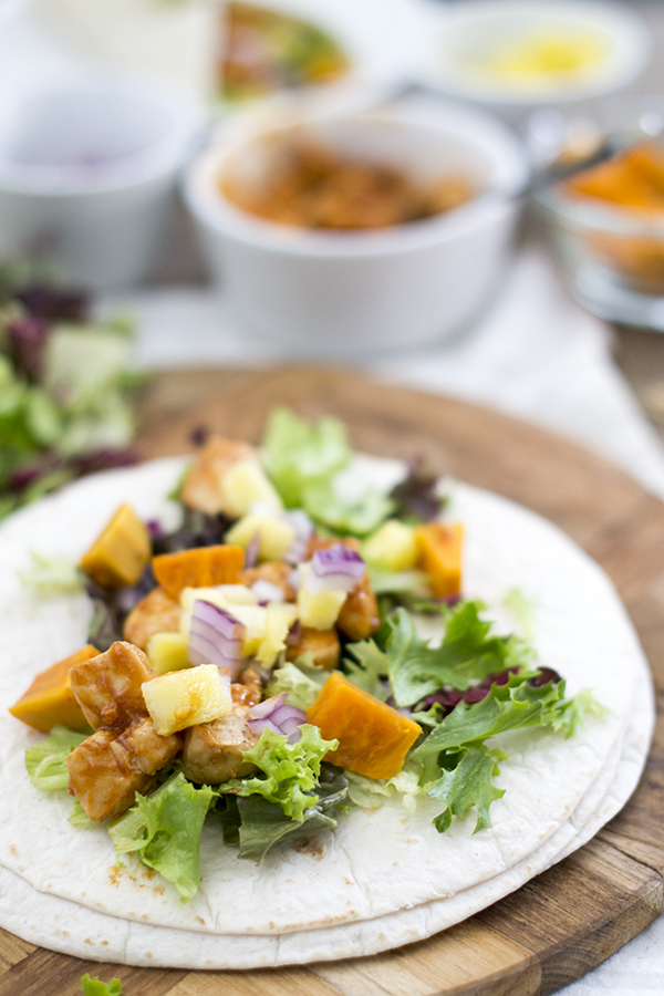 Deze keer combineerde ik de barbecue chicken met een zomerse burrito. Lekker met blokjes zoete aardappel en extra fris door de ananas.