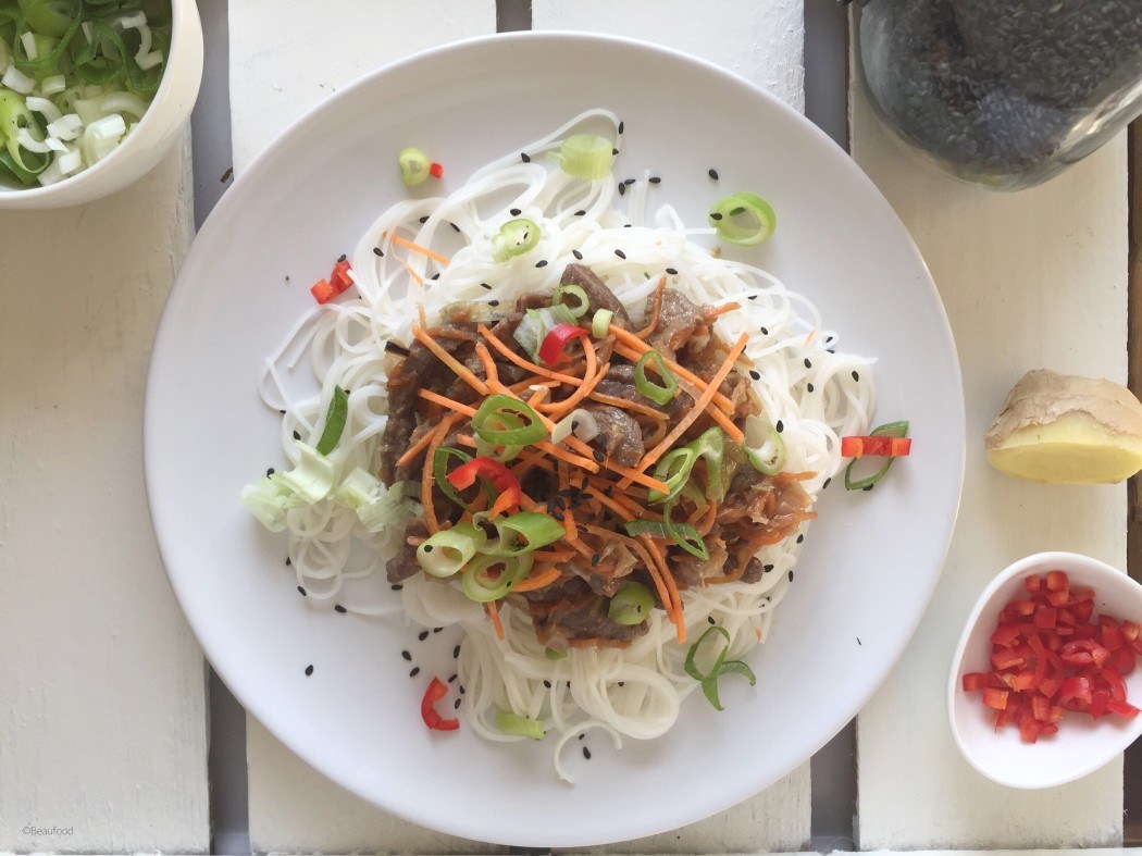 Sinds ik vorige week een klein en onwijs lekker Vietnamees tentje ontdekte in Utrecht ben ik helemaal in de Vietnamese sferen. Ik ben gek op buitenlandse keukens en ik probeer ze een voor een te ontdekken. Vietnamesen gebruiken vaak gember, citroengras, koriander en vissaus in hun gerechten en laat ik daar nou net gek op zijn. Ik heb nog geen tijd gehad om een hotspot artikel over dit tentje te maken, maar hij komt er binnenkort aan! Ik moest vandaag kiezen tussen dit overheerlijke recept voor beefreepjes met rijstnoedels en pindasaus publiceren óf een hotspot en ik denk dat ik wel weet welke jullie liever hebben :)