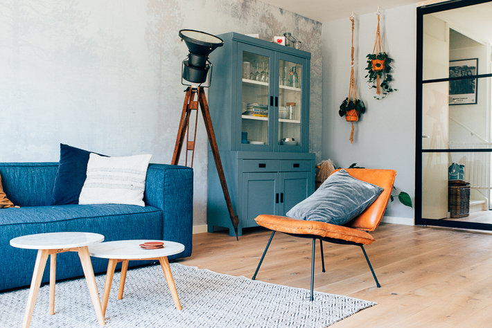 Eigenlijk is alles anders geworden. De bank stond eerst links en nu rechts en bijna ieder meubelstuk is vervangen. Deze blauwe bank kochten we bij Homestock, hij zit (en ligt) echt heerlijk. De pui was eerst wit en heeft Maurits zwart geschilderd (Ral 7021). En we vervingen onze houten jaloezieën voor gordijnen van Fijngordijn. Dat geeft zoveel meer warmte aan de woonkamer.