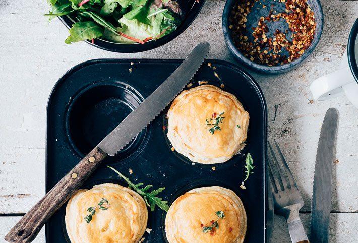 Bij het maken van de bladerdeeg pasteitjes is het belangrijk dat je de bladerdeegdeksel goed tegen het bladerdeegbakje aandrukt. Door de warmte en stoom in de oven en het bakken van het bladerdeeg zet het deeg uit en wil het deeg graag alle kanten op. Het is wat wij allemaal zo lekker vinden aan bladerdeeg, al die knapperige laagjes! Maar wanneer je de deksels niet goed hebt aangedrukt raken ze los. Een groot drama is het niet natuurlijk, want je hebt gewoon 6 losse dekseltjes. Maar wanneer je dat niet wilt, druk de dekseltjes dan goed vast.