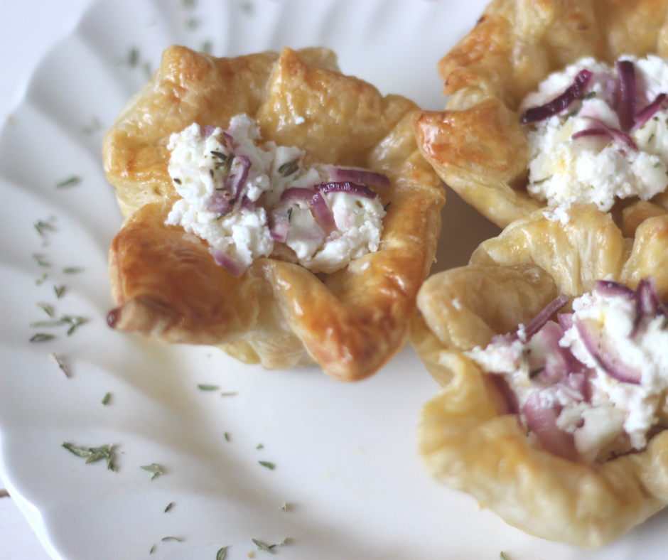 Met bladerdeeg kan je alle kanten op. Je kunt er hartige taart mee maken, lekkere appelflappen of deze krokante bladerdeeghapjes gevuld met geitenkaas, tijm en een beetje pit van rode ui. Een super hapje voor bij de borrel. Het lekkerste is om de hapjes warm te serveren.