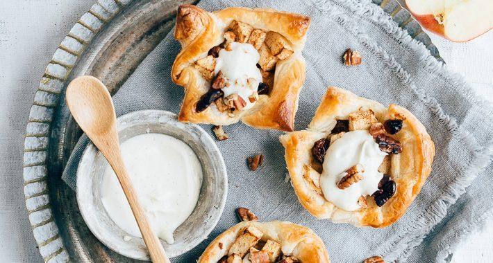 Ingrediƫnten voor 6 stuks 6 plakjes bladerdeeg 2 grote appels 40 gr rozijnen 40 gr pecannoten 1 tl kaneel 1 tl vanille extract 1 eitje om te bestrijken