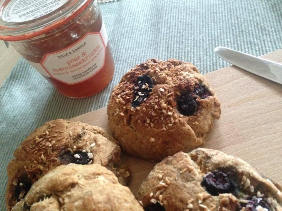 Ik ga graag ergens een kop koffie drinken, in Arnhem zit een heel leuk en gezellige koffiebar. Ze maken hier alles zelf van taarten tot chocolade maar ook scones. Het ziet er heerlijk uit altijd! Ik dacht ik ga ze weer eens zelf maken, maar dan op een gezondere manier. Speltmeel, blauwe bessen en kokosrasp, dat heb ik in dit recept gebruikt. Kokosrasp gebruik ik best vaak. In mijn ontbijt met fruit en noten. Nu als topping van de scones! Scones worden normaal gemaakt met rozijnen, ik heb er blauwe bessen aan toegevoegd. Een heerlijke combi kokos en blauwe bessen. Een echte aanrader bij het zondagochtend ontbijt lekker met opgeklopte room of jam.