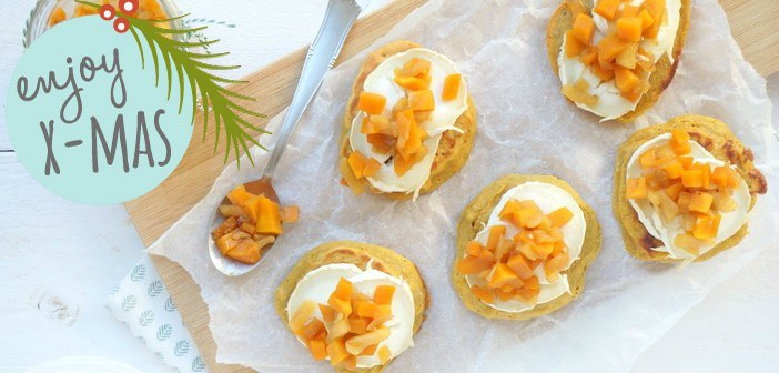 Het is maar 1 keer Kerst per jaar, en als je het dan toch viert, dan kun je dat maar beter goed doen! Lekker uitpakken met het kerstmenu hoort daar helemaal bij, en daarom begin ik mijn kerstmaaltijd met een kleine amuse. Een amuse is een klein hapje dat je voor de gerechten serveert zodat de smaakpapillen alvast een beetje wakker kunnen worden. Nou, dat lukt wel met deze blini met pompoen en geitenkaas! Je kunt er natuurlijk voor kiezen om voor elke gast 1 mini pannenkoekje klaar te maken, en deze blini aan tafel te serveren. Maar kunt ze ook al bij de borrel op tafel zetten... in dat geval zou ik er wel iets meer maken, want ze happen heerlijk weg!