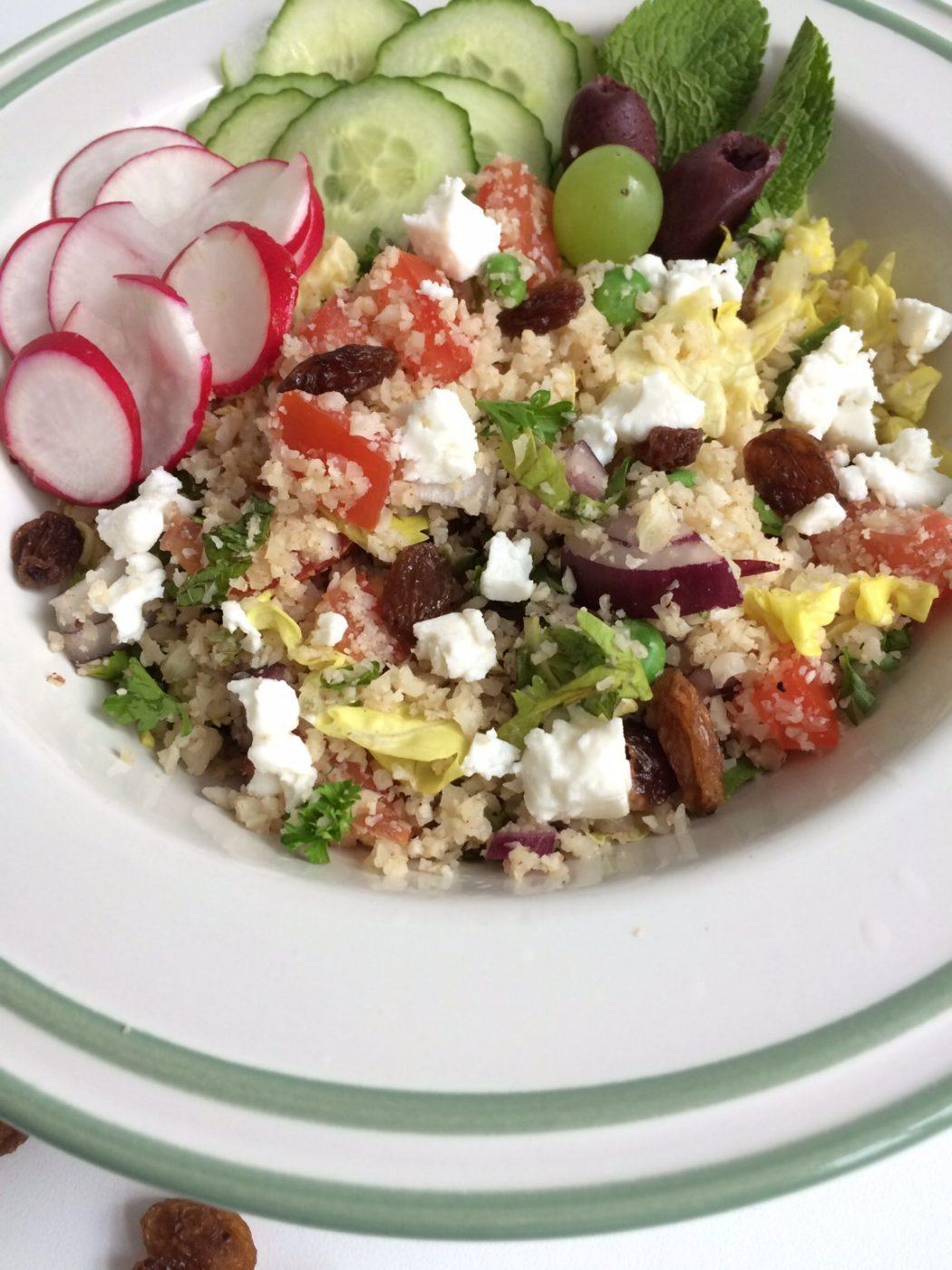 Hmmm met deze zonnige dagen eet ik heel graag een lekkere salade. Maar om nu elke dag iets met sla te eten gaat mij ook vervelen. Ik had bloemkool couscous al een tijdje op mijn "to make" lijstje staan en ik was erg nieuwsgierig hoe dit zou smaken. Zou het echt zo lekker zijn als de echte "couscous"?. Ik ben zeker aangenaam verrast. Het zoete van de rozijnen is heerlijk met het hartige van de feta en de olijven hmmmmm. Op deze manier krijg je ook nog een extra portie groente binnen met de bijbehorende vitaminen. Bloemkool zit vol vezels, vitaminen (veel vitamine C), mineralen (veel calcium) en antioxidanten. En de bloemkolen zijn nu in het seizoen en voordelig. Dat is dan weer mooi meegenomen!