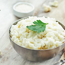 Snijd de bloemkool in roosjes. Maal de roosjes fijn in een keukenmachine, goede blender of gebruik een rasp. Laat de keukenmachine of blender niet te lang doordraaien, dan krijg je bloemkoolpuree in plaats van korrels. Verwarm de kokosolie in een pan en bak de fijne bloemkool 5 minuten op middel hoog vuur. Breng op smaak met zout, peper en eventueel andere kruiden naar keuze. Serveer met een gezonde curry of gewoon met groente en een stuk vlees of vis.