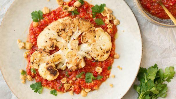 Bloemkoolsteak kun je met tig dingen combineren. Het is een heerlijk vegan alternatief voor vlees of vis. Met deze romescosaus en hazelnoten wordt het helemaal een feestje op je bord. Deze knalrode Spaanse saus wordt gemaakt van gegrilde paprika’s en tomaat.