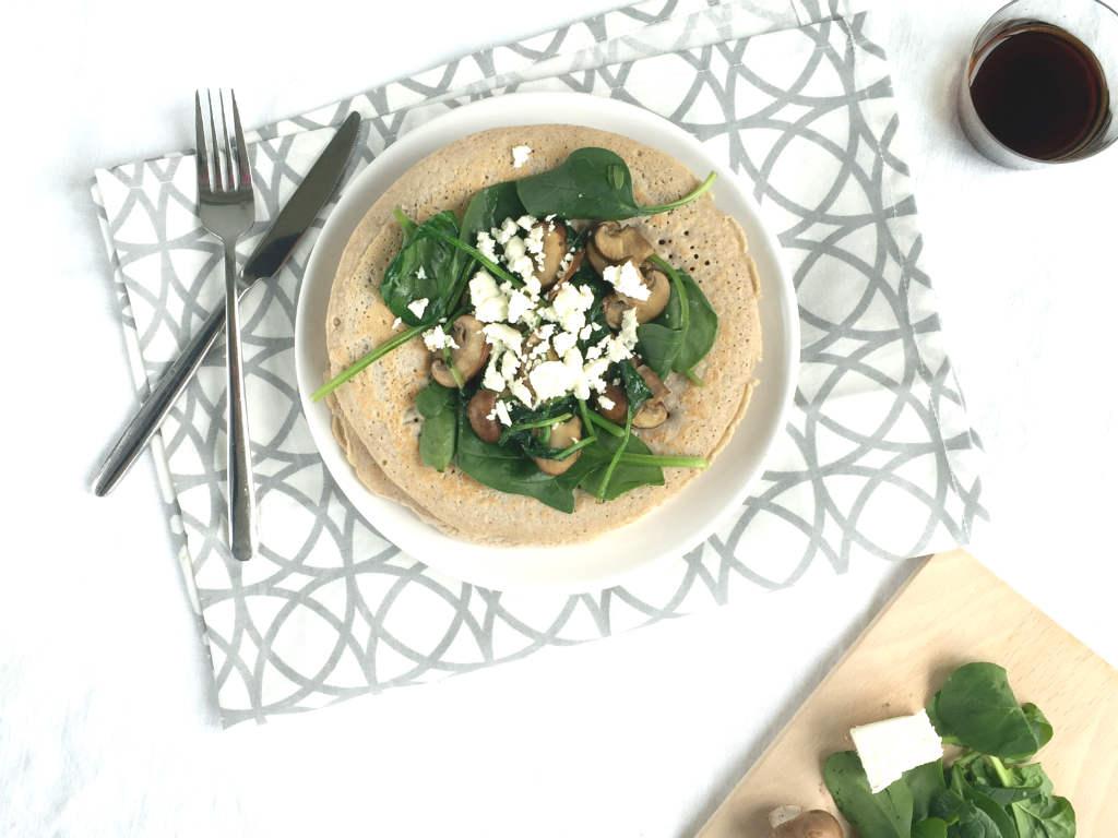 Na een voedzame bodem kun je natuurlijk aan de slag met poedersuiker, stroop of wat dan ook. Heb je er wel eens aan gedacht om een hartige variant te maken? Zo ben ik gek op een avocado doperwtenspread. Of inspecteer je koelkast op restjes groente. Zo vond ik nog spinazie en kastanjechampignons en in combinatie met de sojasaus, pitten en feta vond ik het echt een taartje. Een hartige pannenkoek met een bite!