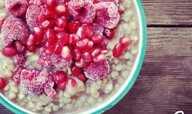 Mmmmm een heel lekker ontbijtje van de meiden van The Green Happiness: boekweitpapje met frambozen en granaatappelpitjes! De zachte, (lauw)warme boekweit combineert perfect met het frisse, rode zomerfruit. Geweldig begin van je dag!