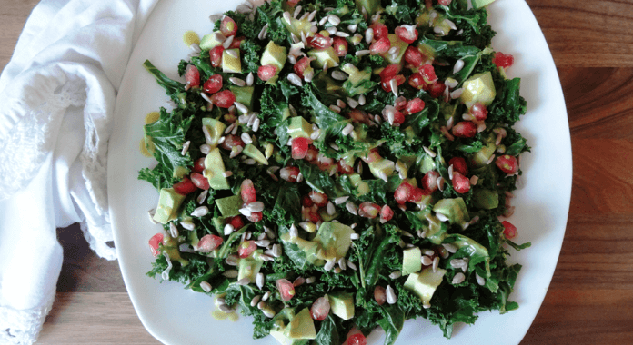 Een rauwe boerenkoolsalade… Op het eerste oog klinkt dat misschien niet heel erg lekker. Maar vergis je niet, dit is een heel erg lekkere en feestelijke salade! In dit recept is het de bedoeling dat je een dressing in de boerenkool kneed en masseert. En dat klinkt gek, maar het werkt fantastisch, want hierdoor wordt de dressing heel goed opgenomen door de boerenkool, de boerenkool wordt zacht maar niet ‘soppig’ en alle smaken komen veel beter tot hun recht op deze manier.