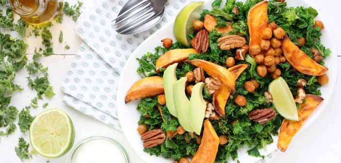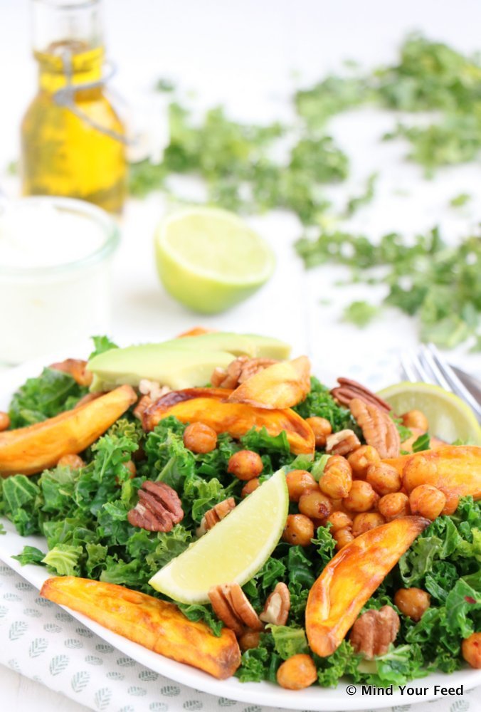 Nu januari weer voorbij is, begin ik langzaamaan wat voorjaarskriebels te krijgen. Nog niet heel serieus hoor, want ik hoorde dat er nog een paar koude dagen aankomen. Maar toch begin ik weer eens na te denken over wat lichtere gerechten. En wie heeft er eigenlijk bedacht dat je in de winter geen salades eet? Nou daar ben ik het mooi niet mee eens… Boerenkool is natuurlijk een typische wintergroente, maar zo veelzijdig, dat ie prima in deze boerenkoolsalade met zoete aardappel en kikkererwten past. Lekker als lunch, maar als bijgerecht kan zeker ook!