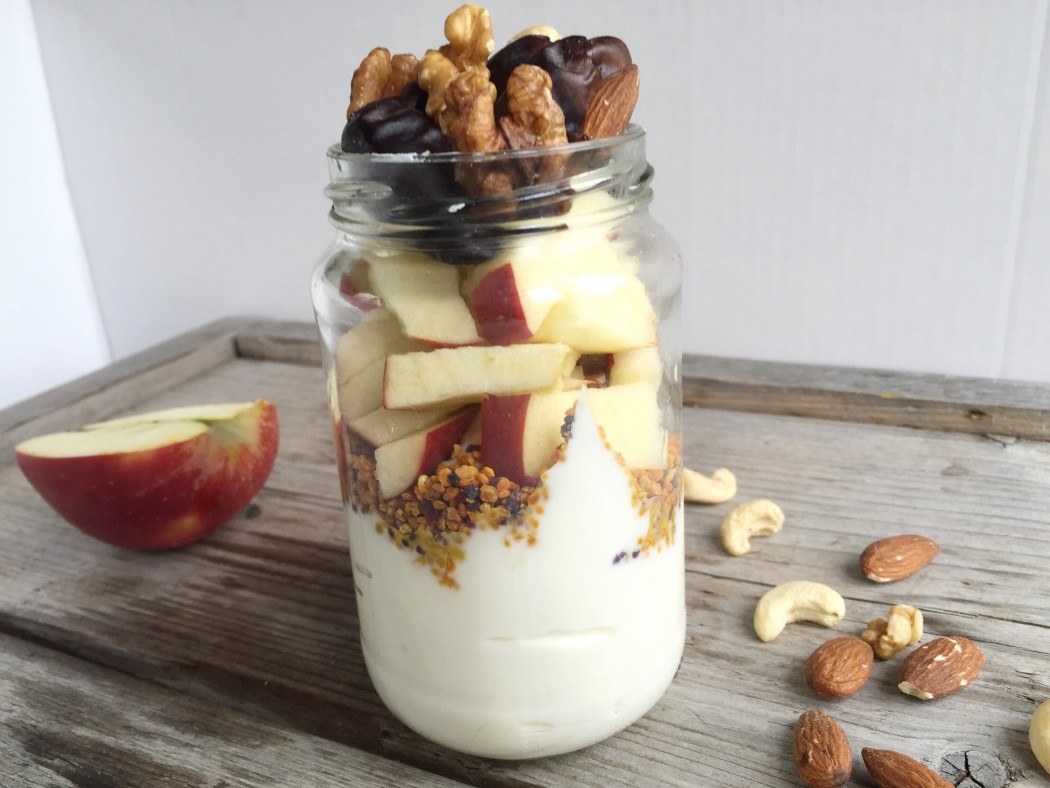 Alle soorten maak ik af met verschillende soorten superfoods. Op dit moment ben ik helemaal gek van bijenpollen en cacaonibs! Vandaag deel ik de eerste variant met jullie, de breakfast jar met yoghurt en fruit.