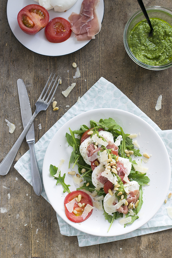 Als lunch trakteerde ik mijzelf de afgelopen week daarom op deze lekkere caprese salade met parmaham en pesto. Binnen no time zet je deze salade op tafel, ook lekker als voorgerechtje. Of maak een grotere variant om te serveren bij de barbecue of een etentje zodat iedereen lekker kan opscheppen.