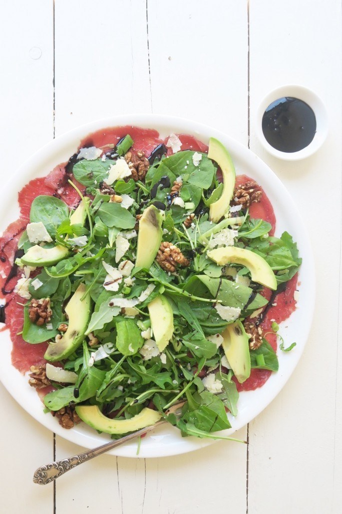 Carpaccio staat veelal bekend als voorgerecht maar je kunt er ook een heerlijke salade van maken. Met wat groen zoals spinazie en avocado, parmezaanse kaas en balsamicomaak je er binnen no time een gezonde lunch van. Het lekkerst is als je de slager vraagt om de carpaccio vers voor je af te snijden, maar bij de versafdeling van de supermarkt kunt je ook gewoon terecht. Maar is (rood) vlees nou gezond of niet? Hier zijn de meningen sterk over verdeeld en ik geef je hieronder de mijne.