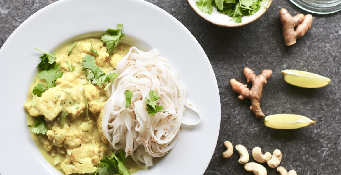 Curry’s zijn het perfecte gerecht voor wanneer je een restje groenten in de koelkast hebt liggen dat op moet. Bloemkool in mijn geval! Ik zag Jamie Oliver ooit een curry pasta maken waarbij hij eerst de cashews, knoflook en lente ui roosterde in een droge koekenpan. Wanneer je dat vervolgens pureert tot pasta geeft dat een extra geroosterd smaakje aan de paste. Héél lekker! Ik maakte een voorraadje dat ik in porties bewaar in de vriezer. Handig voor wanneer je geen zin hebt om boodschappen te doen en dus nog wat leftovers groenten in huis hebt. Ik heb ook altijd een pak rijstnoedels op voorraad voor dit soort gerechten. Aanrader!