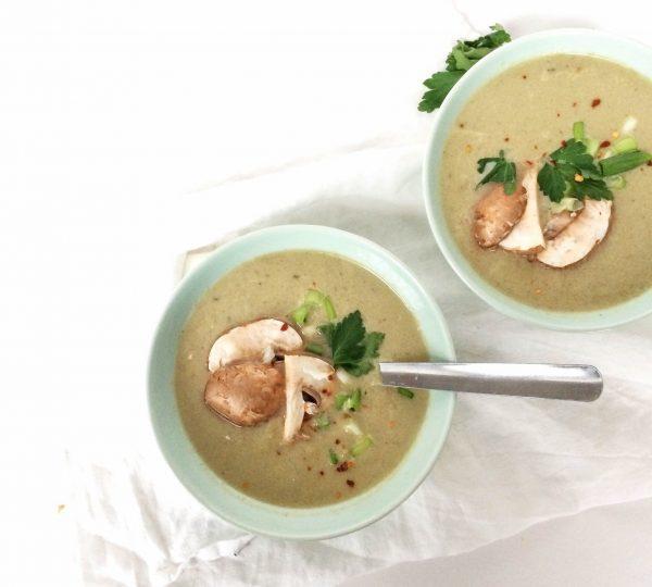 De combinatie van champignon en bosui vind ik echt heerlijk en eens scheutje plantaardig kookroom maak de soep net wat dikker en romiger, maar niet té.