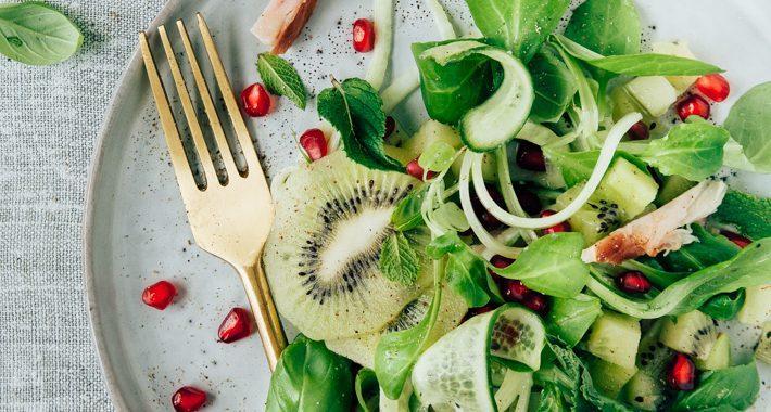 Echt heel leuk is de combinatie komkommer en kiwi. Dat klinkt heel spannend, maar wanneer je ze samen eet lijken ze wel voor elkaar gemaakt. De kiwi’s hoeven niet eens heel rijp te zijn. Dat is ook weer een geruststelling wanneer je het gaat maken en ze blijken nog een beetje hard. Verder maak je er in een handomdraai een chique dressing van witte wijn (of champagne) met geitenkaas bij.