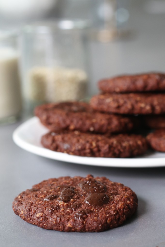 Omdat ik afgelopen zondag gespijbeld heb met Zondag Bakdag heb ik vandaag als goedmakertje een HEEL lekker, gezond en super easy koekjesrecept voor je. Deze chocolade havermoutkoeken zijn vrij van gluten en gezoet met stroop van dadels. Eigenlijk zijn er twee zoetmakers die ik standaard in de keuken heb: honing en dadelstroop. Dadelstroop kocht ik altijd bij de natuurwinkel maar lang leve de gezonde voeding trend (geloof mij, deze trend gaat nooooit meer over), want tegenwoordig koop je deze lekkere stroop gewoon bij de Appie voor een leuk prijsje. Geweldig in koekjes, fantastisch over pannenkoeken en heerlijk door je yoghurt. Kortom: moeite waard om een grote pot aan te schaffen.