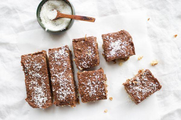 Vorige week maakte ik deze raw en vegan cheesecake met sinaasappel. Terwijl ik dit taartje aan het maken was, kwam het idee van deze chocolade-kokos slice naar boven. Eindelijk was het weekend en had ik de tijd om aan de slag te gaan. Chocoladeliefhebbers, deze chocolade-kokos slice moeten jullie echt maken!