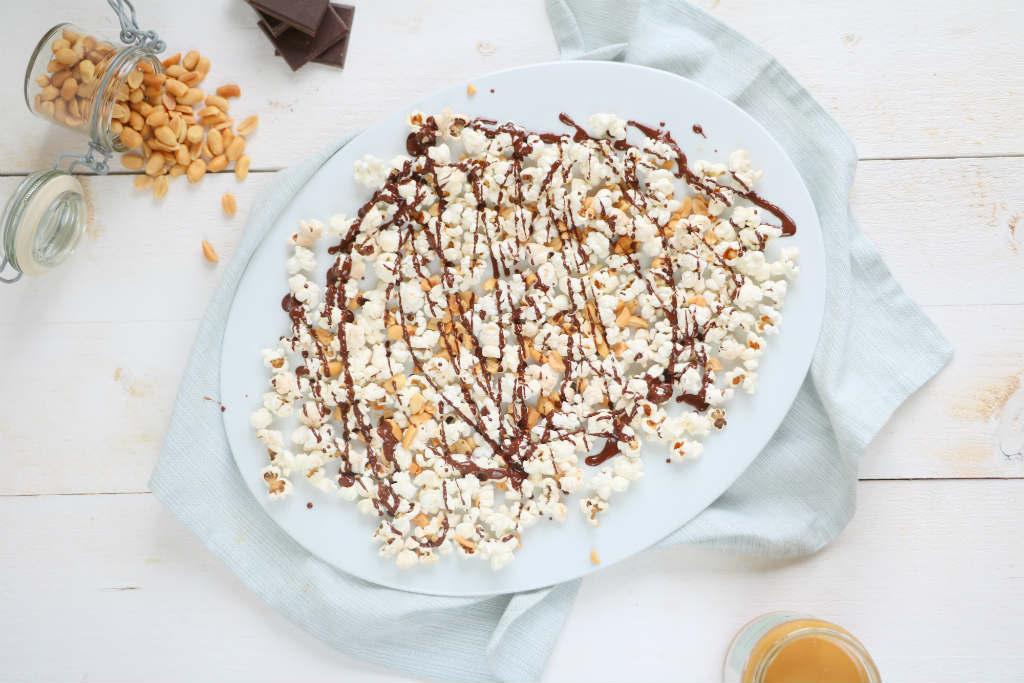 Nog nooit heb ik popcorn gepoft in een koekenpan. Wat een ideale manier om gezond te snacken. Een klein beetje zout en je bent klaar. Voor de zoetekauwen onder ons ben ik verder gegaan met de chocolade popcorn van Bo. Ik zocht een soort van snickers popcorn. Wat zou er gebeuren als je pindakaas verwarmt en er stukjes noot aan toevoegt?