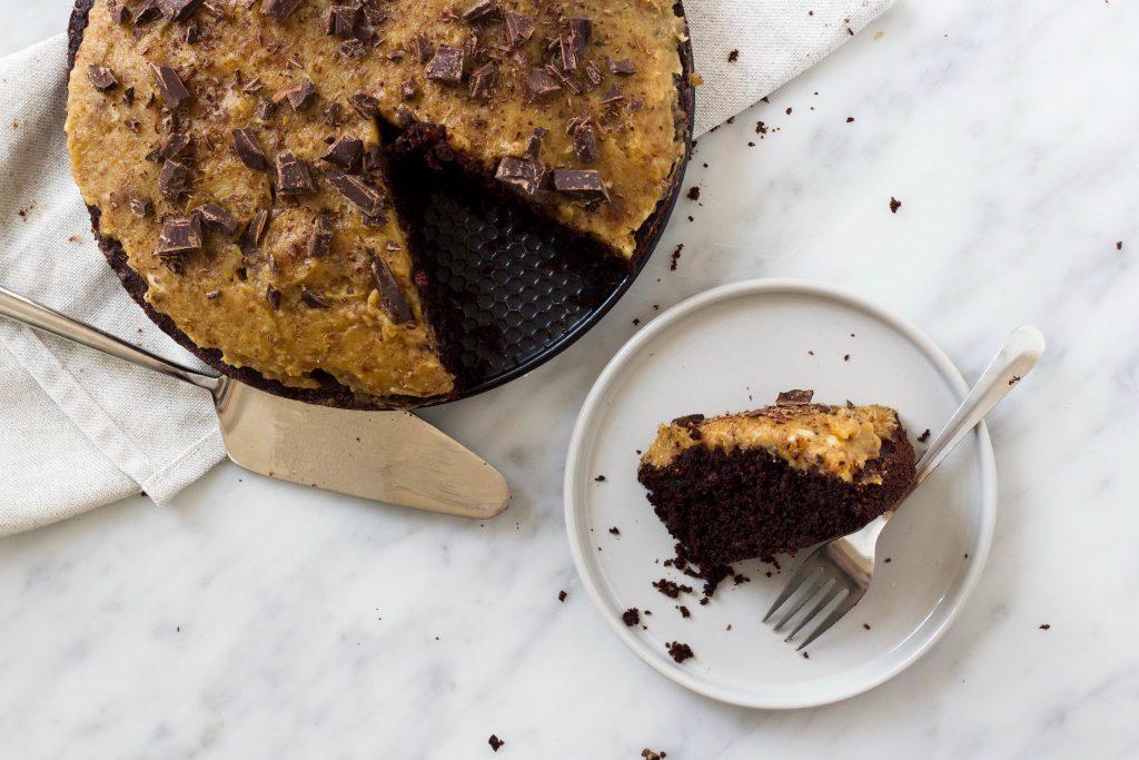 Verder is het een kwestie van alles mengen in een kom, het beslag in een vorm gieten en in de oven schuiven. Echt, deze taart kan niet mislukken en je maakt iedereen gelukkig met chocolade en een topping van salted caramel…