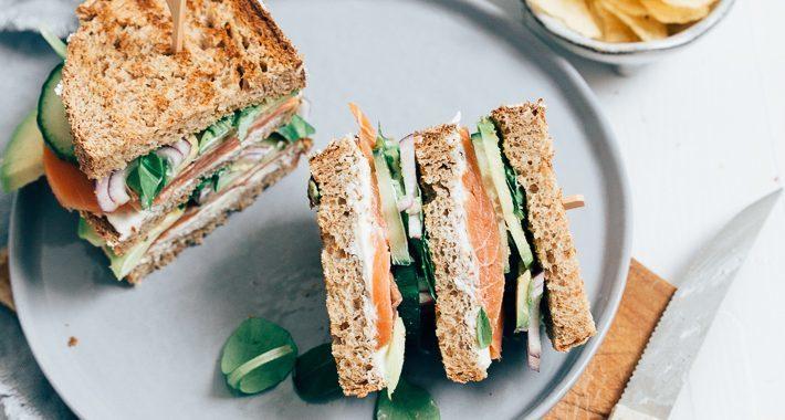 In plaats van zalm kan je ook een club veg maken met gegrilde groentes zoals paprika, courgette en aubergine. Daarvan staat ook een receptje in mijn nieuwste boek Feel Good Food. Ik gebruik dan in plaats van gewoon brood, flatbread. Ook een aanrader.