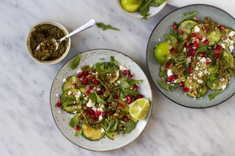 Groene pesto en courgette heb ik altijd al een heerlijk combinatie gevonden. Let wel op dat je niet teveel pesto gebruikt, want deze overheerst snel. Een paar druppeltjes per bord is genoeg. De granaatappel zorgt voor een frisse bite in het gerecht en dat het gerecht er kleurrijk uit ziet.