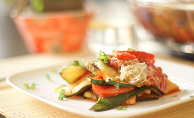 Mijn moeder maakte vroeg heel vaak een te lekkere lasagne. Stiekem is dat nog steeds mijn favoriet, maar er gaat een enorme lading crème fraîche in en natuurlijk lasagnebladen. Ik besloot daarom het recept eens te maken zonder de crème fraîche en zonder de lasagnebladen en dat bleek echt een groot succes. Super smaakvol en heel vullend doordat er kip en courgette in zit.