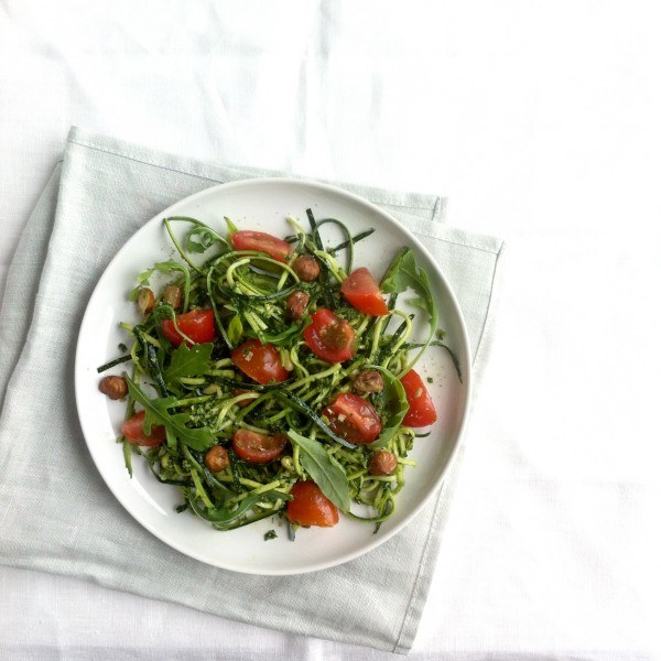 Cougetti; pasta van courgette! Geen witte meelproducten met suiker, die je moe maken na het eten, maar een extra portie groenten op je bord. Deze courgetti is geheel plantaardig, doordat de pesto zonder kaas wordt gemaakt.