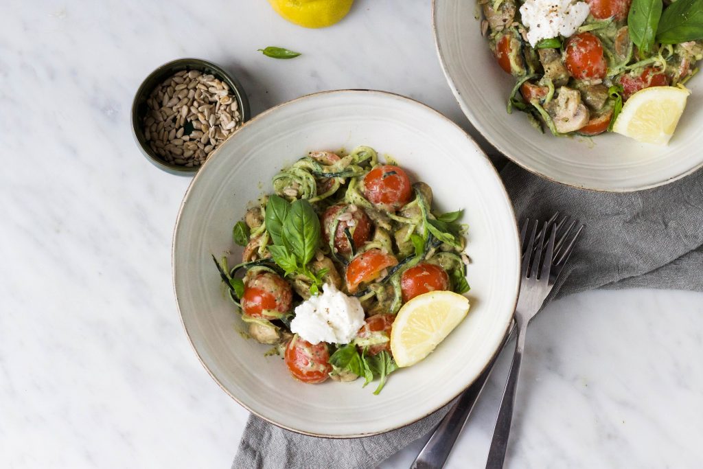 Een heerlijke romige ricotta pesto saus die dus in 1 minuut is gemaakt! De rest van het gerecht is ook een makkie. Champignons bakken, tomaatjes snijden en de courgette tot reepjes raspen met een spirelli.