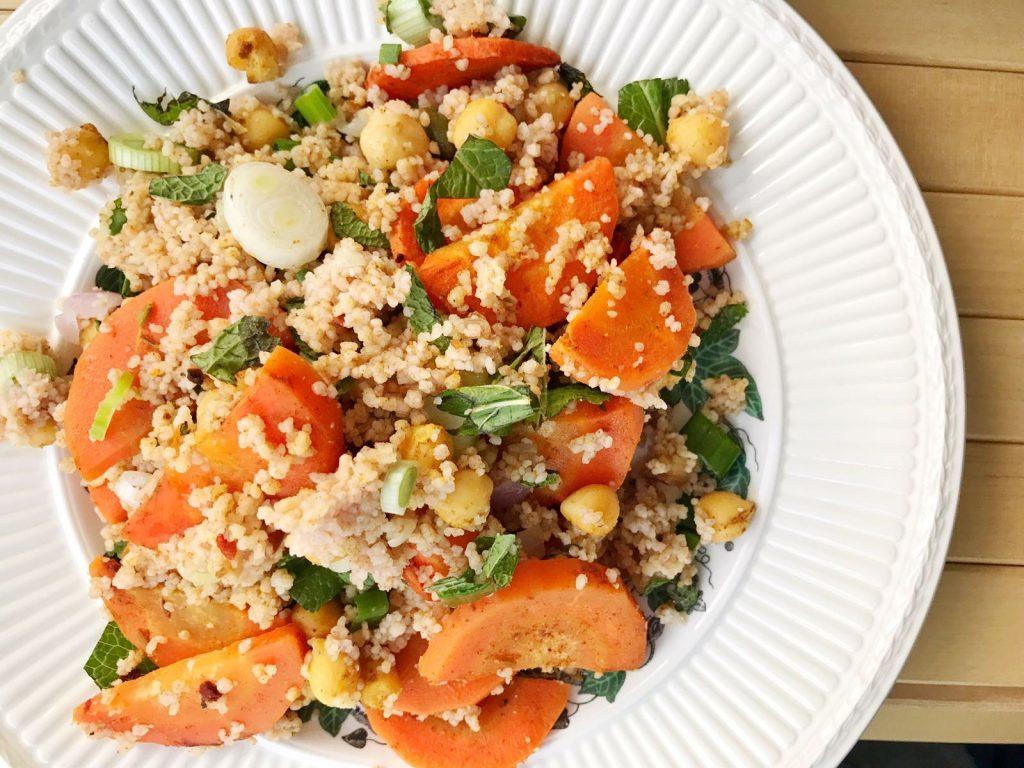 Deze couscoussalade met geroosterde wortel en Marokkaanse kruiden is geïnspireerd op een salade van Lisa. Sinds ik de vegan challenge ben aangegaan ben ik regelmatig op haar blog te vinden voor antwoorden op mijn vragen maar ook om inspiratie op te doen voor eigen recepten. Deze salade zag er zó kleurrijk uit, die móest ik proberen. Het is dan ook een vegan salade. Hieronder deel ik met jullie het recept voor een couscoussalade met geroosterde wortel en Marokkaanse kruiden.