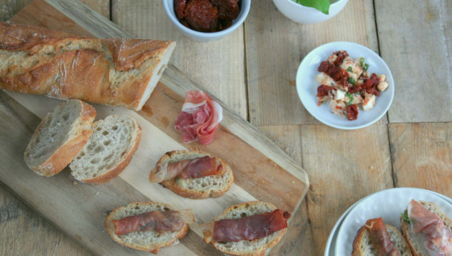 Crostini met rauwe ham, zongedroogde tomaat en mozzarella