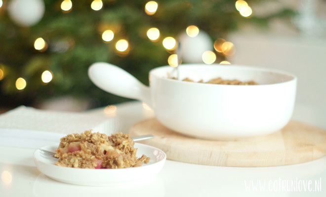 Last minute toch nog een kerst dessert wat ik met jullie wil delen. Deze appel crumble is namelijk overheerlijk en doet het altijd goed als dessert. Eerder deelde ik al eens een appel crumble met amandelmeel, deze variant is iets minder verantwoord maar moet kunnen voor bijzondere gelegenheden!