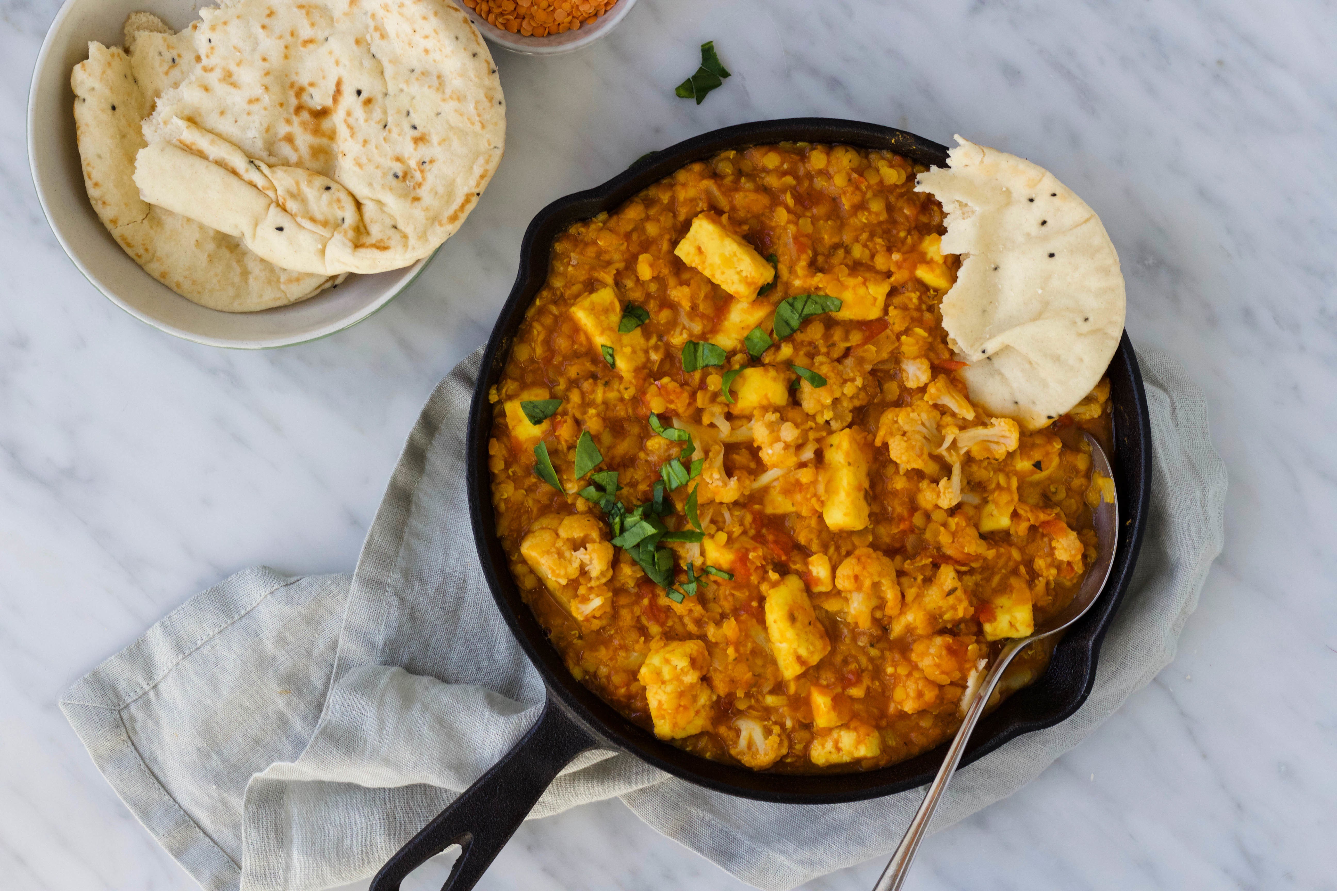Dahl is niet alleen heerlijk comfort food, maar ook voedzaam. De curry zit vol eiwitten en ijzer door de linzen. De bloemkool geeft een bite en de paneer is lekker romig. Oh, ik vind paneer echt zo lekker!
