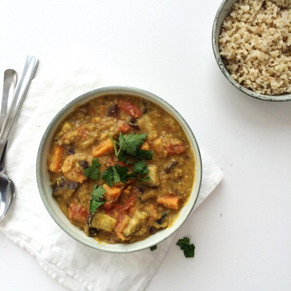 Dahl is een currygerecht gemaakt van rode linzen en komt oorspronkelijk uit India. Het wordt vaak gegeten in combinatie met naanbrood of rijst. De eerste keer dat ik deze linzencurry at was ik meteen fan. Wat is dit lekker! Aan de slag om thuis zelf een variant te maken dus. Ik voegde een zoete aardappel en aubergine toe en at de linzencurry met bruine rijst.