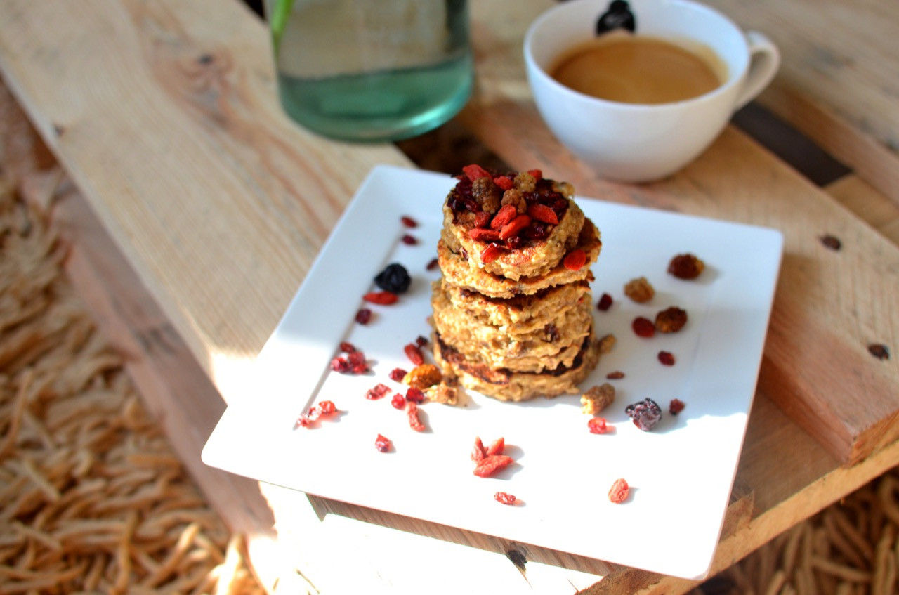 Hoe maken we deze? Simpel! Prak de bananen fijn, voeg de eieren toe en mix het tot een glad geheel. Vervolgens strooi je de havermout en bessenmix erbij en je beslag is klaar! Natuurlijk gebruik ik weer de kokosolie van Puur & Kracht om mijn pannenkoekjes in te bakken. De grootte van de pannenkoekjes bepaal je natuurlijk zelf; ik doe maar wat. Hupsakee, in de pan die handel, af en toe draaien en klaar is kees! Ik strooi er nog wat bessenmix overheen omdat mooi eten ook lekkerder smaakt en ze zijn klaar om gegeten te worden!